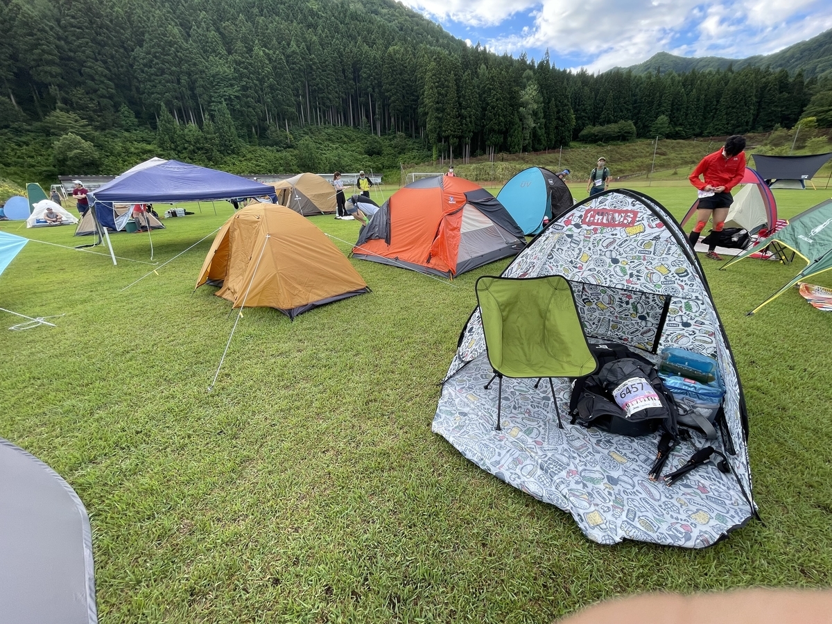 スタートから 4時間 ほどでメイン会場帰還!余裕度ありで前進していた割にはおよそ目標時間どおり。休憩は 15 分だけと決めていたので、手早くベースキャンプで休憩、補給、着替えを済ませます。