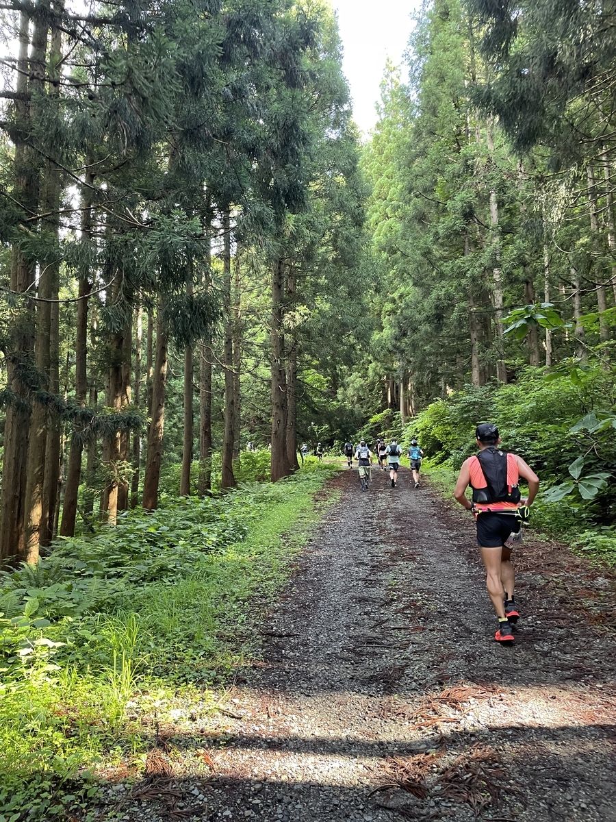 自分はひとり会場に立ち寄って忘れ物を回収し(ここでマットを踏むと優勝しかねないので、歩く場所を慎重に選びつつ)、なんのために最初の坂を頑張ったんだと嘆きながら、ルートに戻って林道へ突入してゆきます。この林道は走ろうと思えば走れる林道で、誰もが各々のペースで進んでいました。